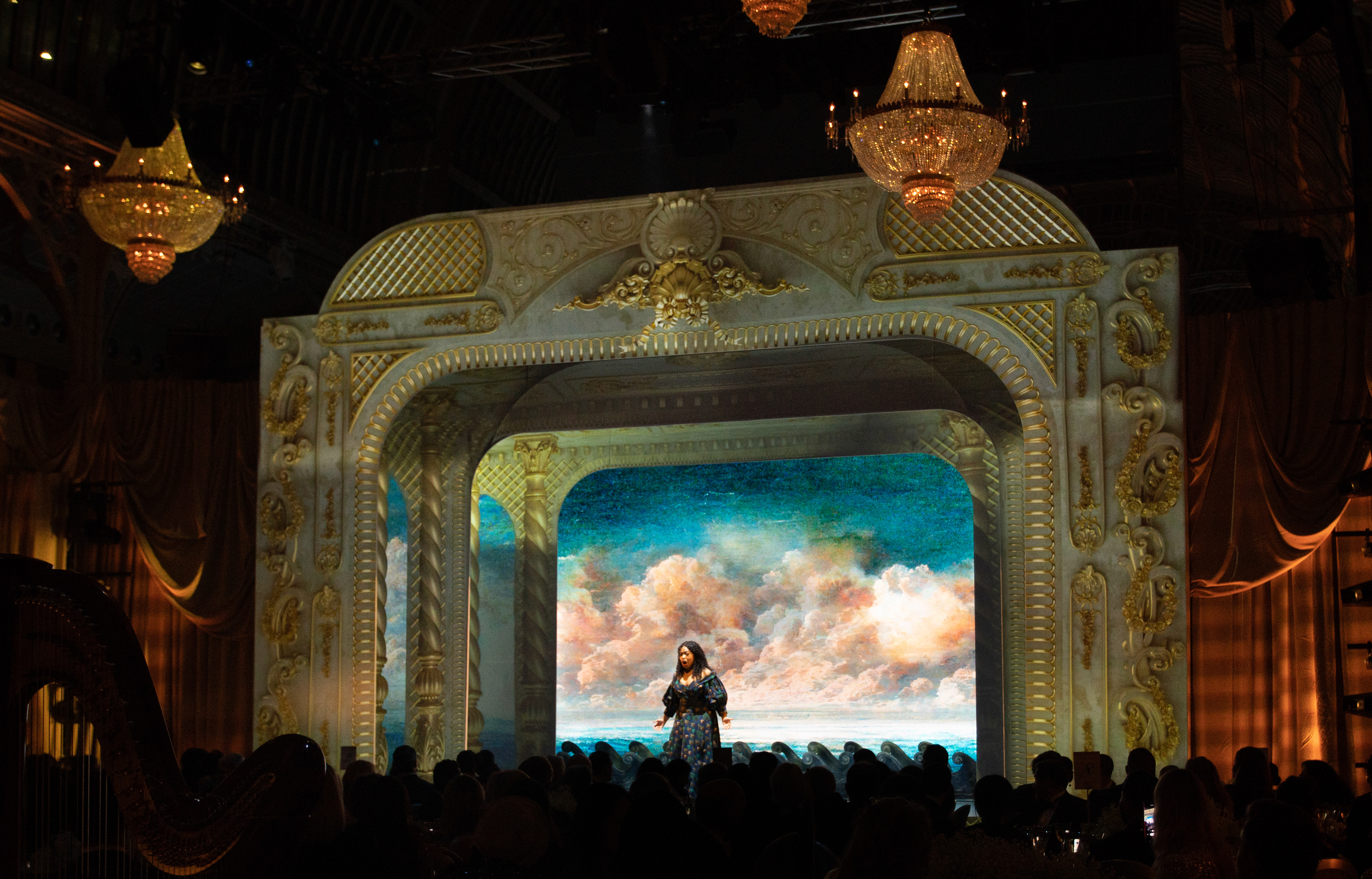 Finally, the reactive and real-time sound content was composited with the pre-rendered graphics and divided into the various chapters of the show. Classical dancers and musicians alternated on stage, accompanied by the orchestra, who marked the various moments of the dinner, concluding with the presentation of the new jewelry collection proposed by the client.