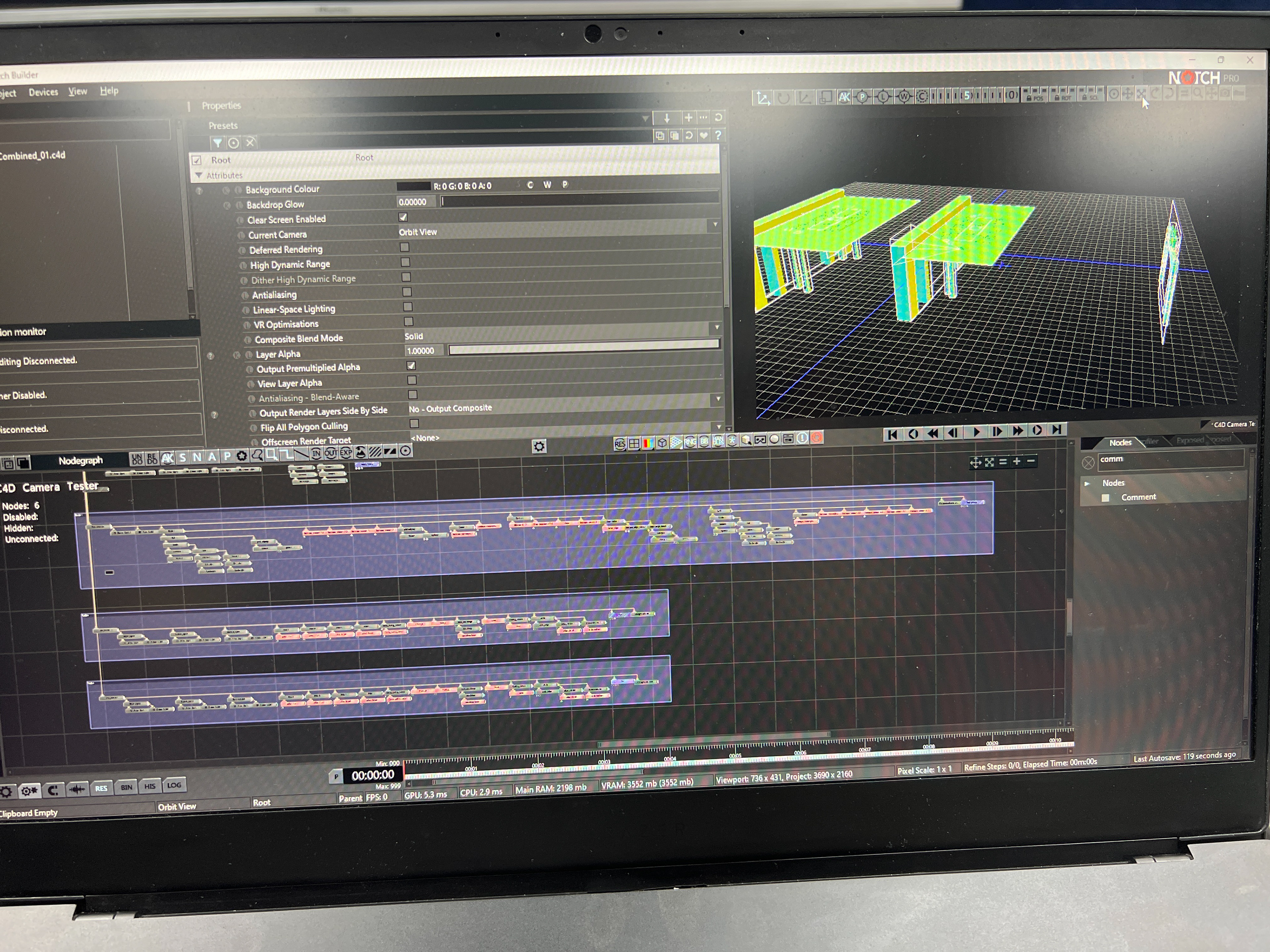 After having produced some concept development projects we spent several days in a service that provided us with a room entirely set up for the pre-production of the show. We had the disguise media server and all the network connections necessary to edit the Notch blocks in real time. Here we retouched and adapted the visuals to the scenes and prepared the different timelines of the show, this allowed us to digitally pre-visualize the entire show inserted inside the stage and theater in 3D.