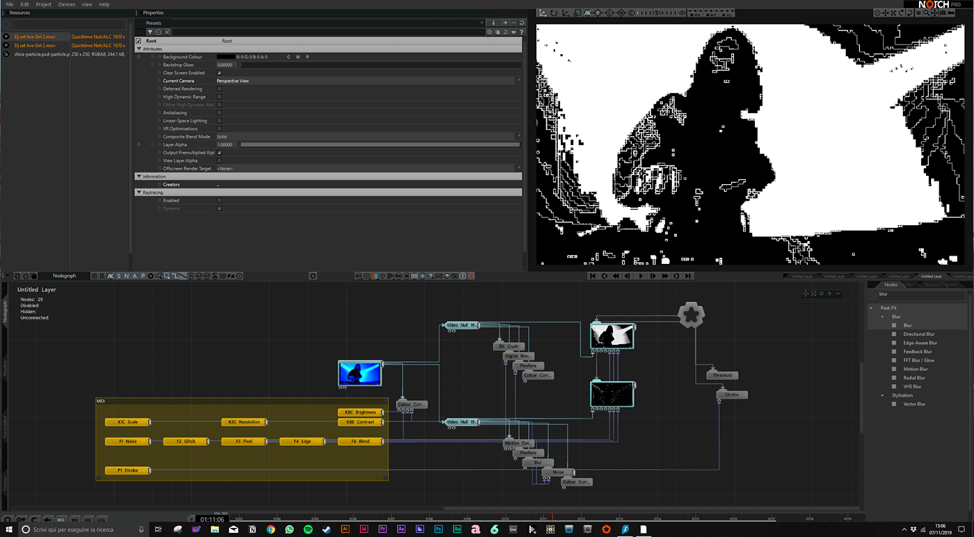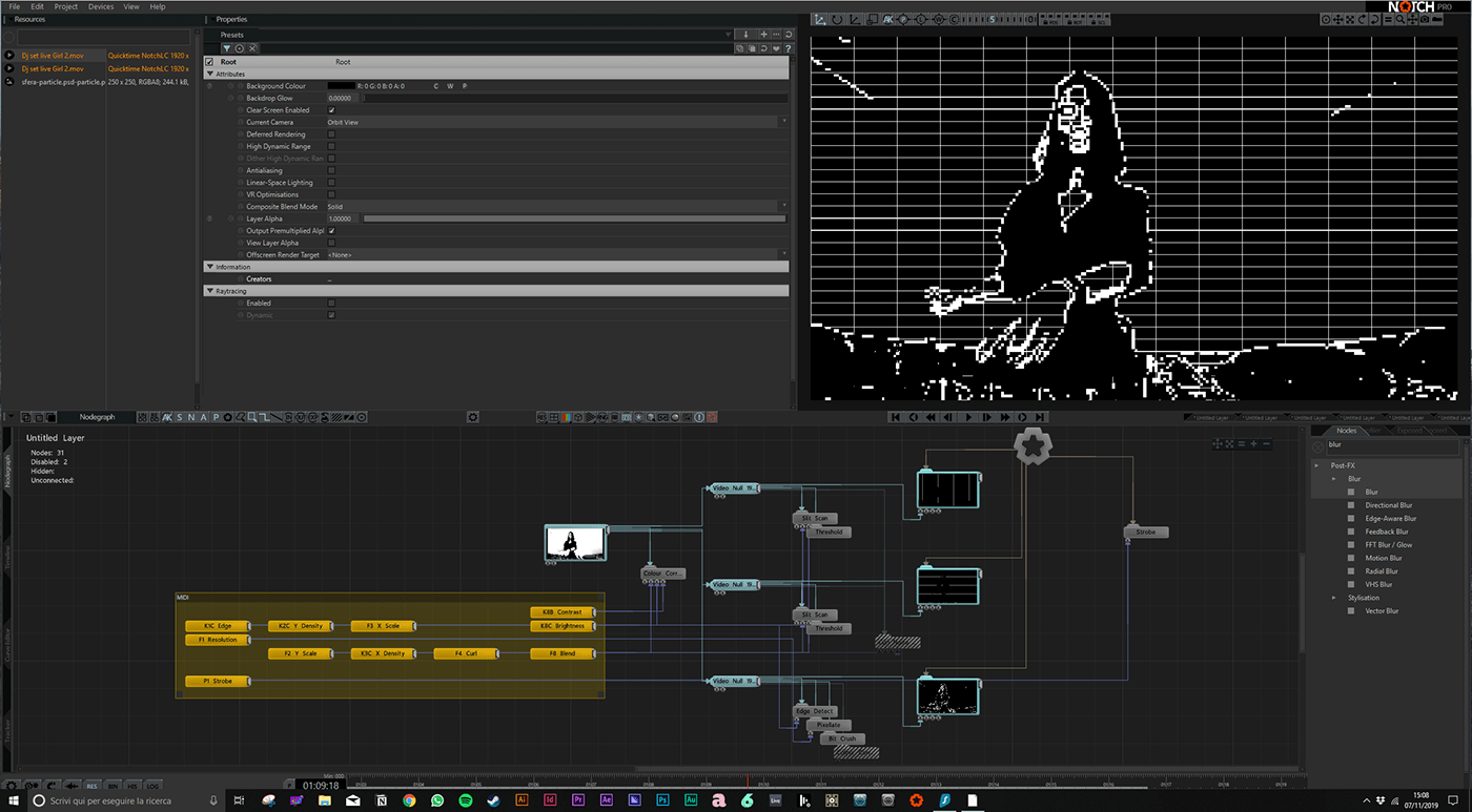 For this project I designed some video effects for the camera live, using Notch Builder, for the Club to Club music festival in Torino, November 2019. I prepared a series of filters that interact with the camera, modifying the video in output; I did seven patches, which were then used during the live DJ sets with a Launch Control XL midi controller.