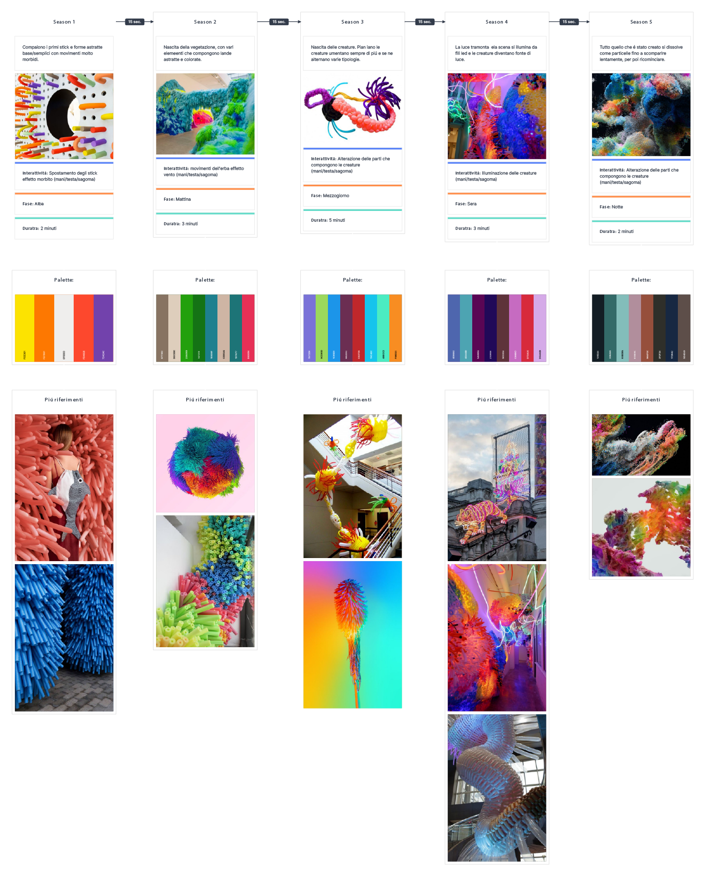 At the heart of the installation, the shapes evolve into various creatures. Their appearance marks the transition from a world of abstract shapes to a universe populated by entities that react and adapt to the spaces and movements of the participants.