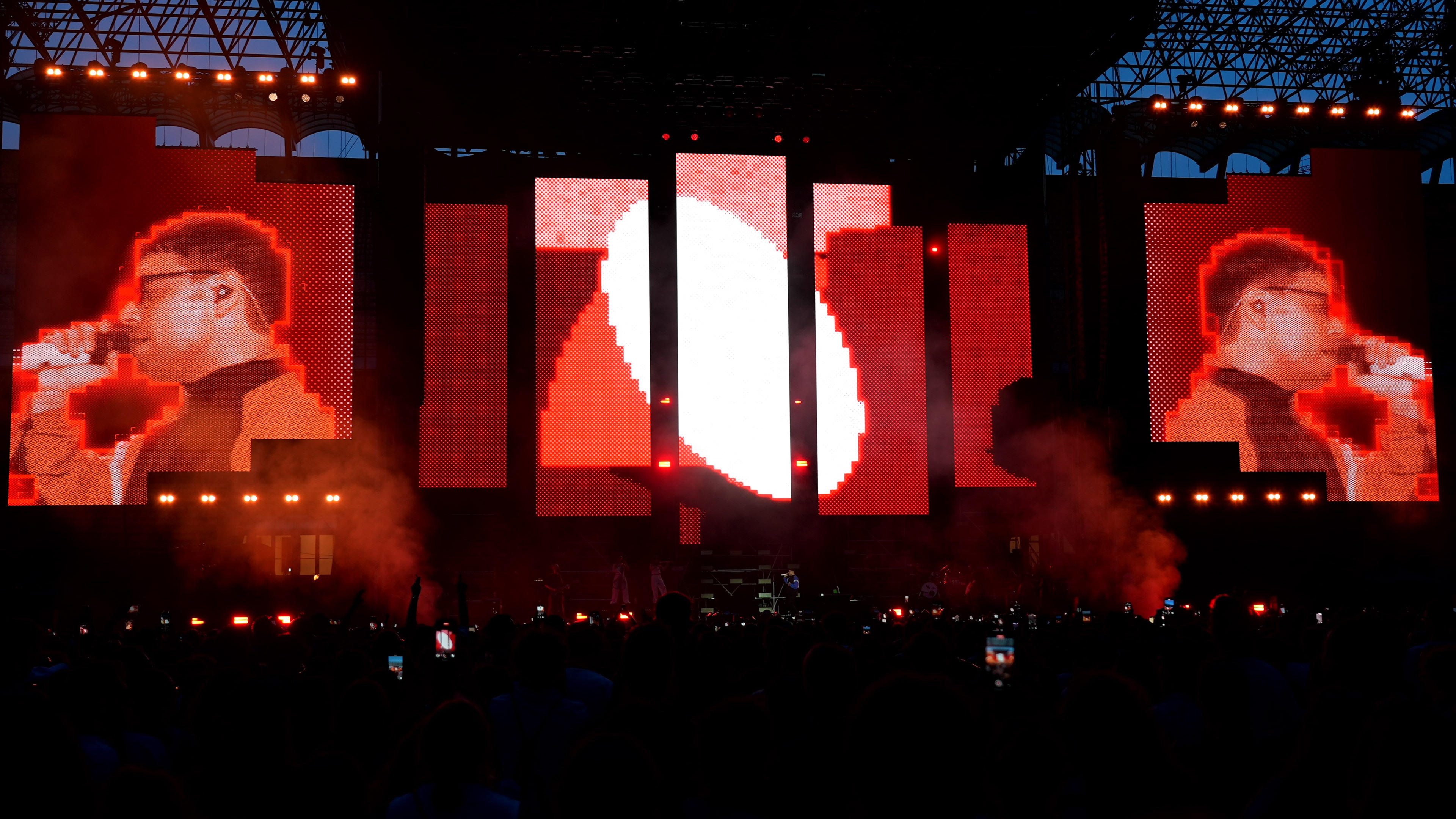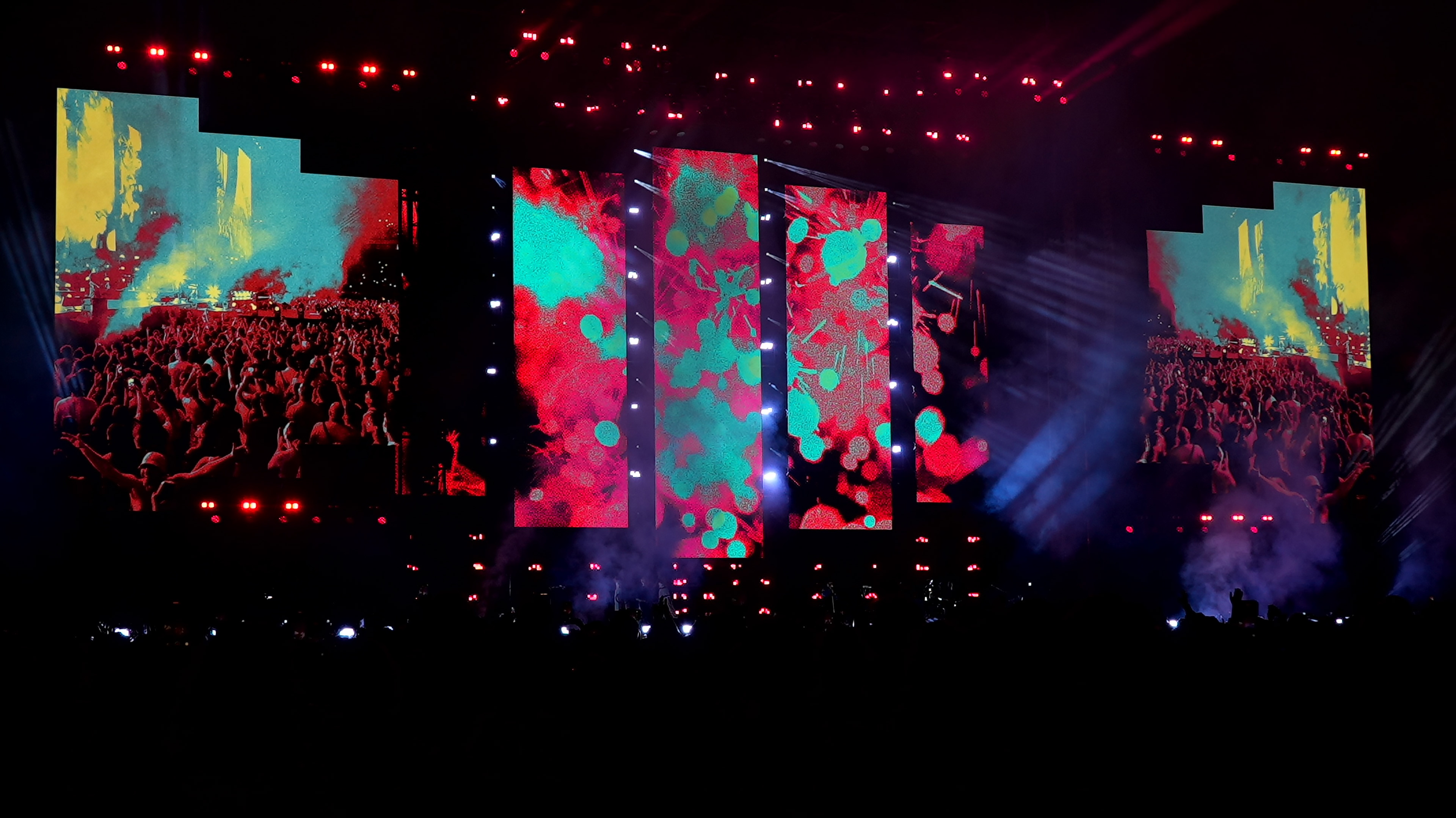 The customized shapes and graphic layouts of the IMAG gave the show its identity, distinguishing it from simple support projections and turning it into a central element of the performance.