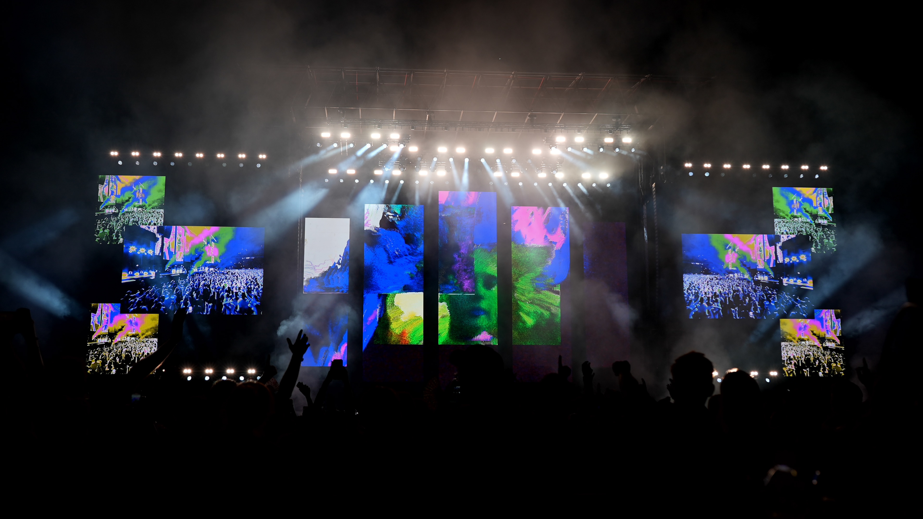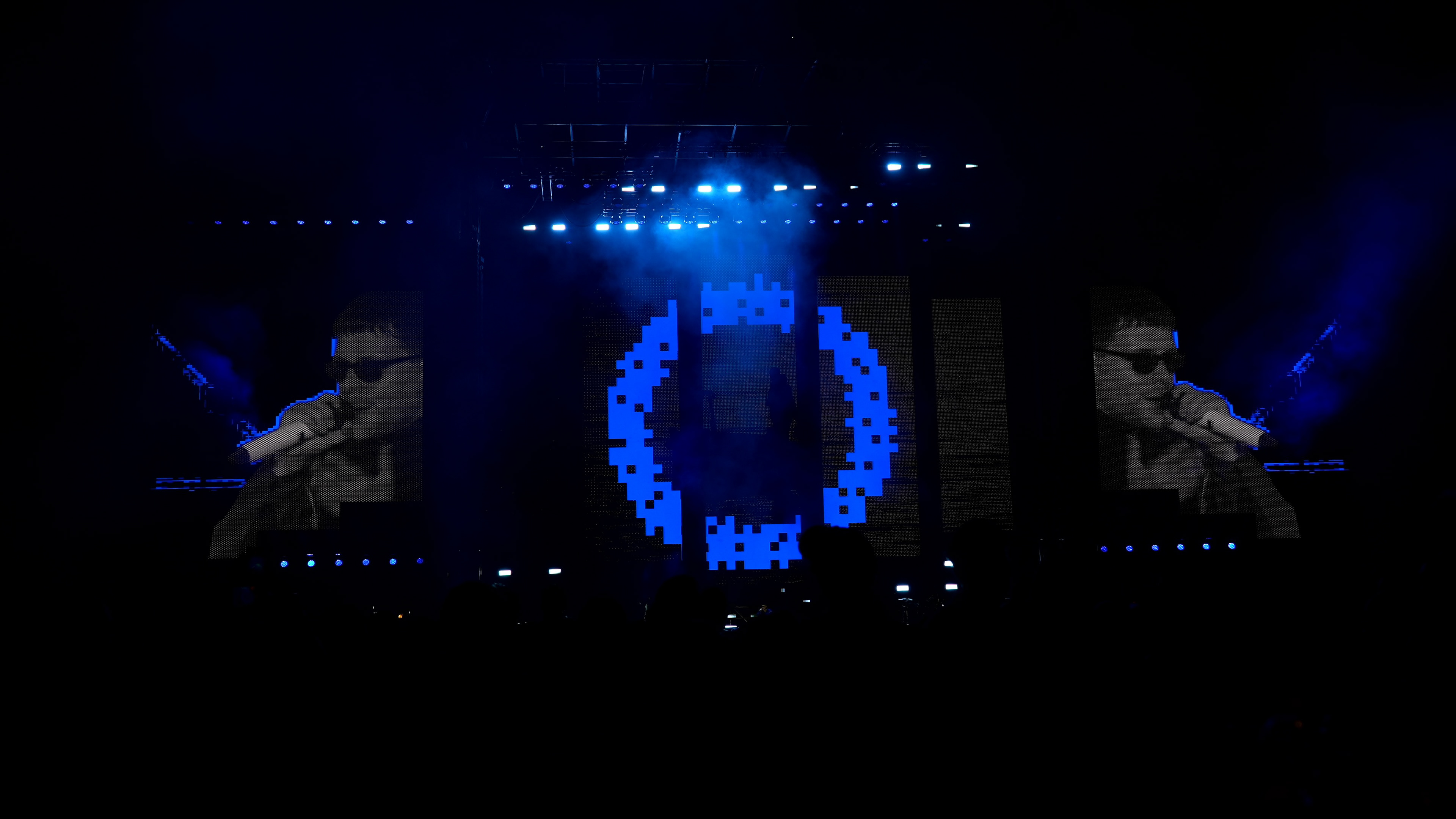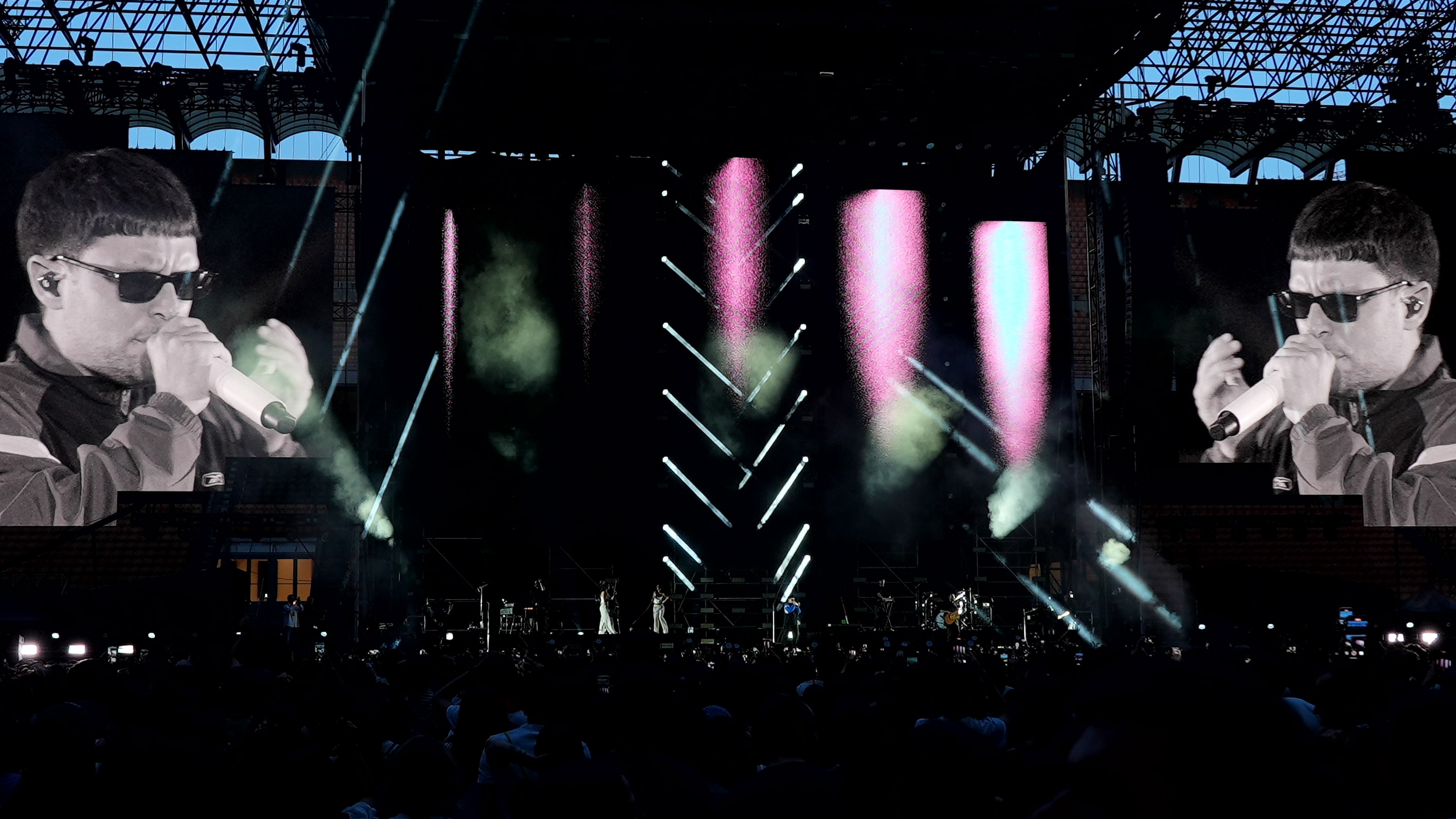 The modular screens made it possible to develop a dynamic visual setup: live footage of the singer and musicians was processed in real time, enhanced with color effects, glitches, and graphic stylizations that turned it into an integral part of the scenography.