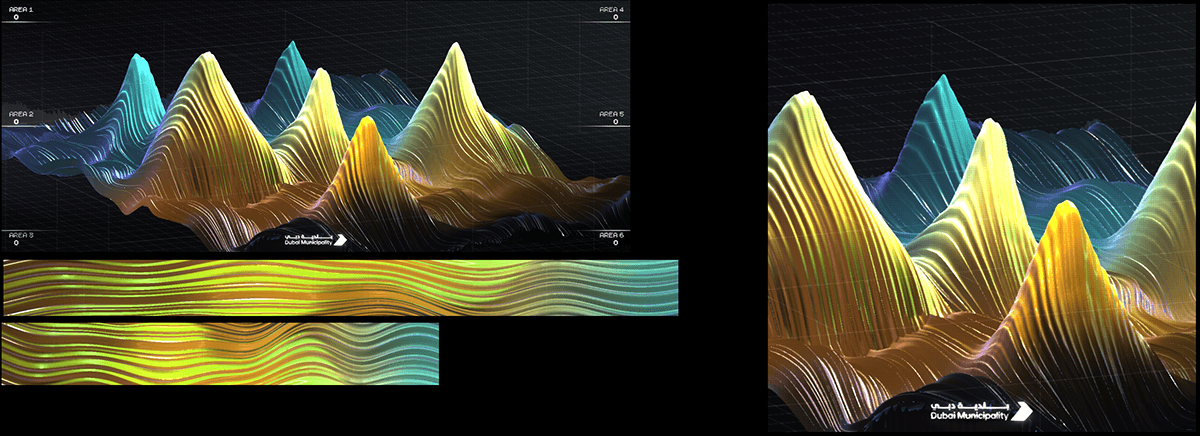 As crowd density increases, the graphics transform: colors intensify, and shapes expand, creating a visual effect that simulates the intensity of human flow. Conversely, in areas with lower density, the graphics become subtler and lighter, reflecting a sense of open space.