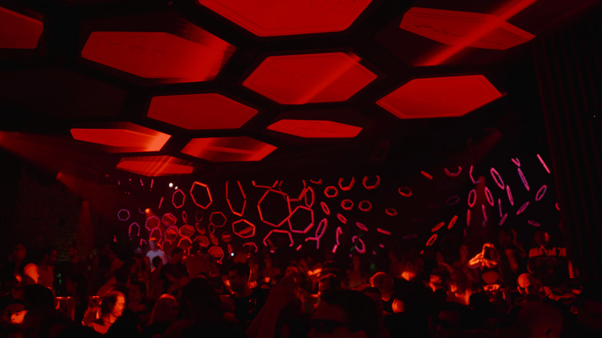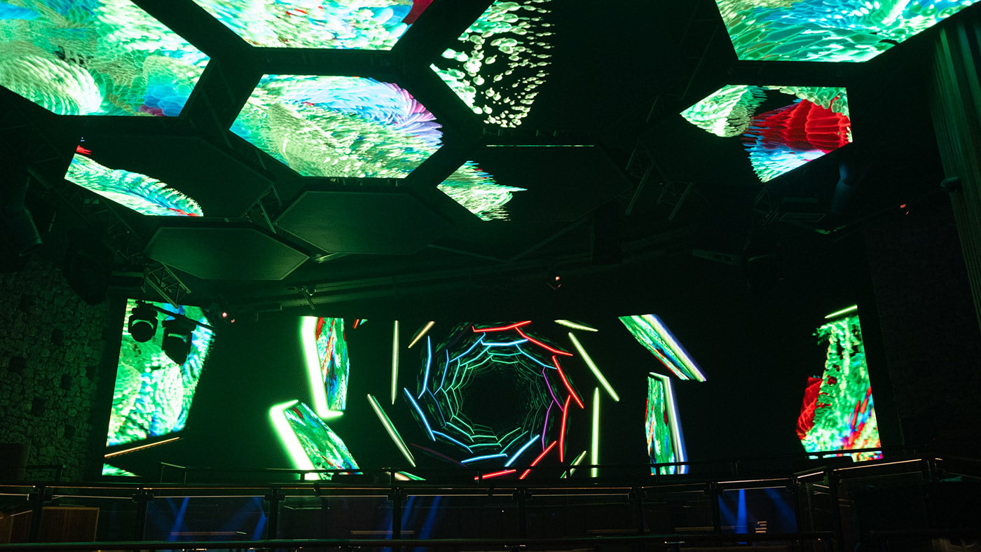 The core of the project involved crafting almost 100 unique scenes in Notch, each designed to process visuals in real-time. These visuals were seamlessly integrated into the hexagonal ceiling screens, where they served as dynamic textures that coordinated with the VJs' live performances. This setup allowed for an ever-evolving visual environment that responded instantly to the energy of the club.