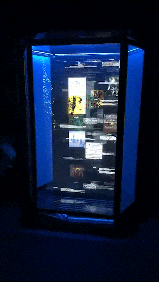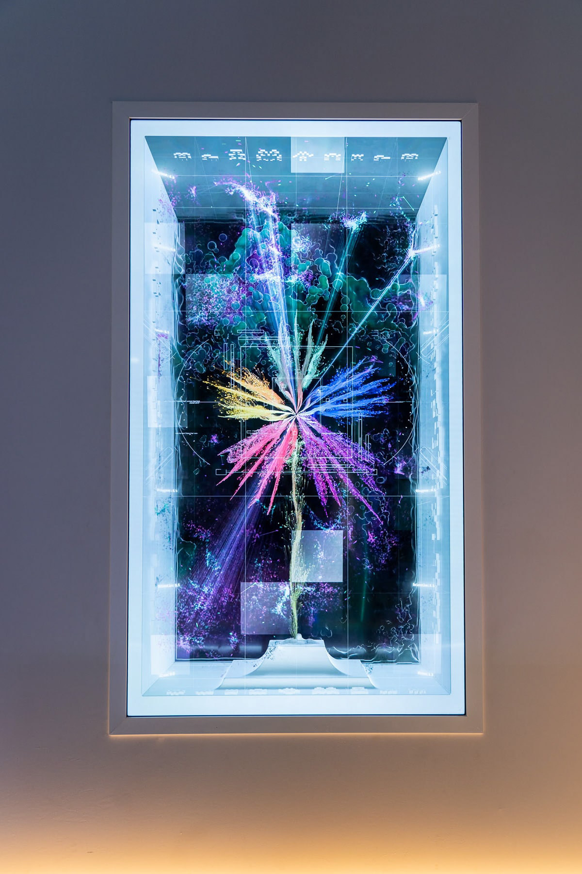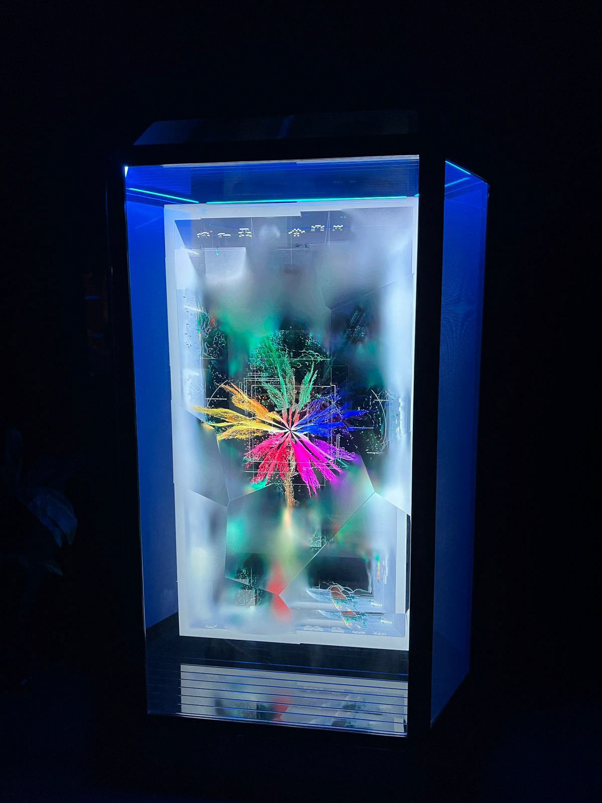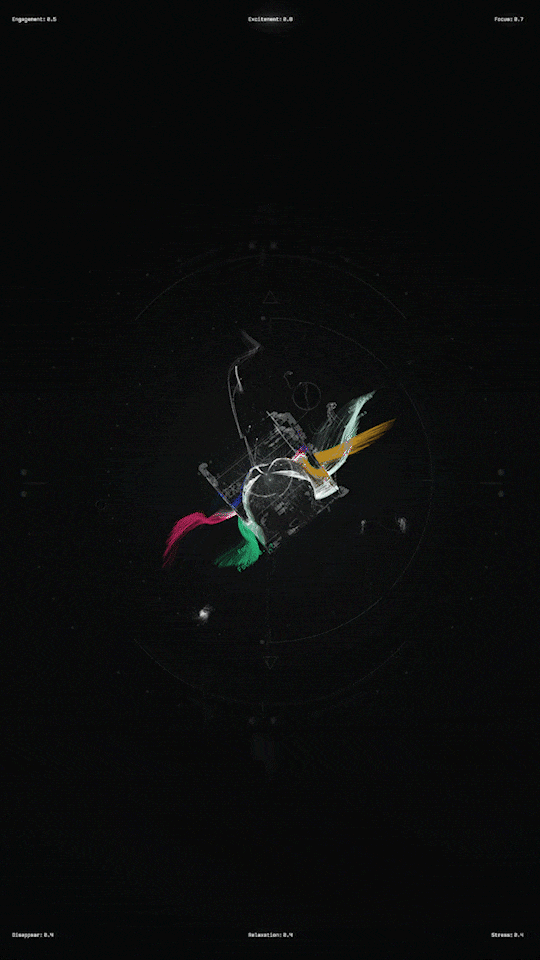 Positioned in front of the installation, the user was exposed to a rapid sequence of images designed to evoke a wide range of emotions. These reactions were not only felt but also measured using Emotive brainwave sensors. This technology recorded the participant’s emotional states in real-time, translating them into raw data that reflected the complexity of their experience. These emotions were then transformed into a visual language that came to life as a unique and personal artwork.