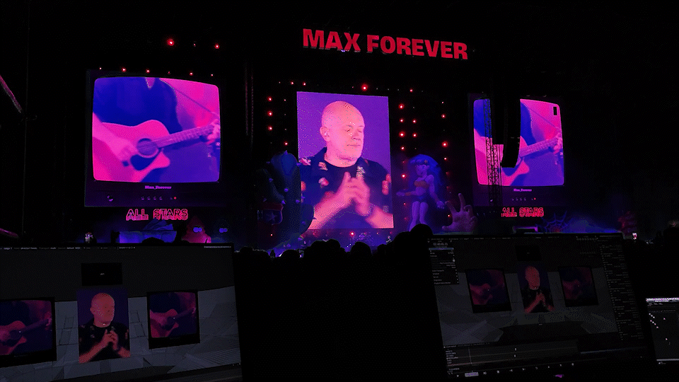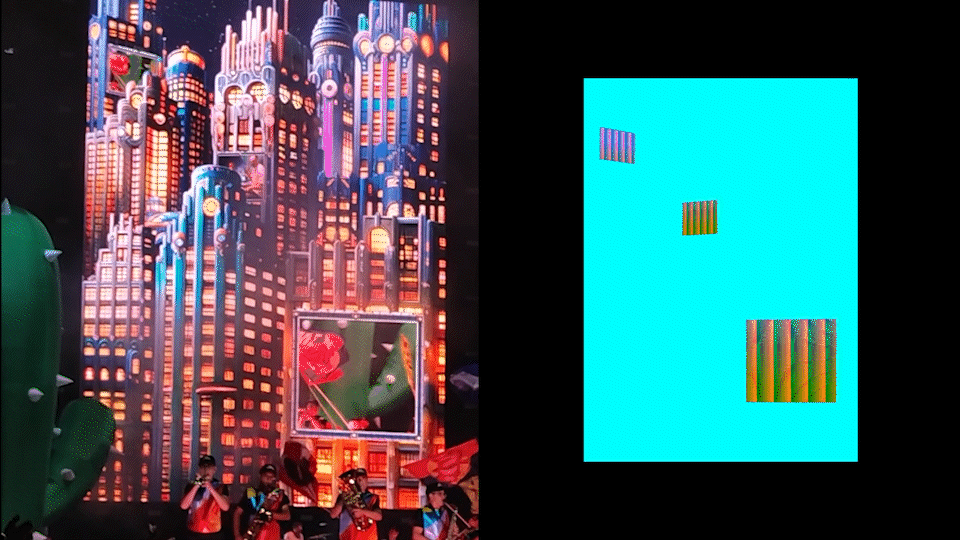 The entire visual composition was created in Notch, a real-time graphics tool that allowed for rapid iteration, flexibility, and direct integration with live camera feeds.