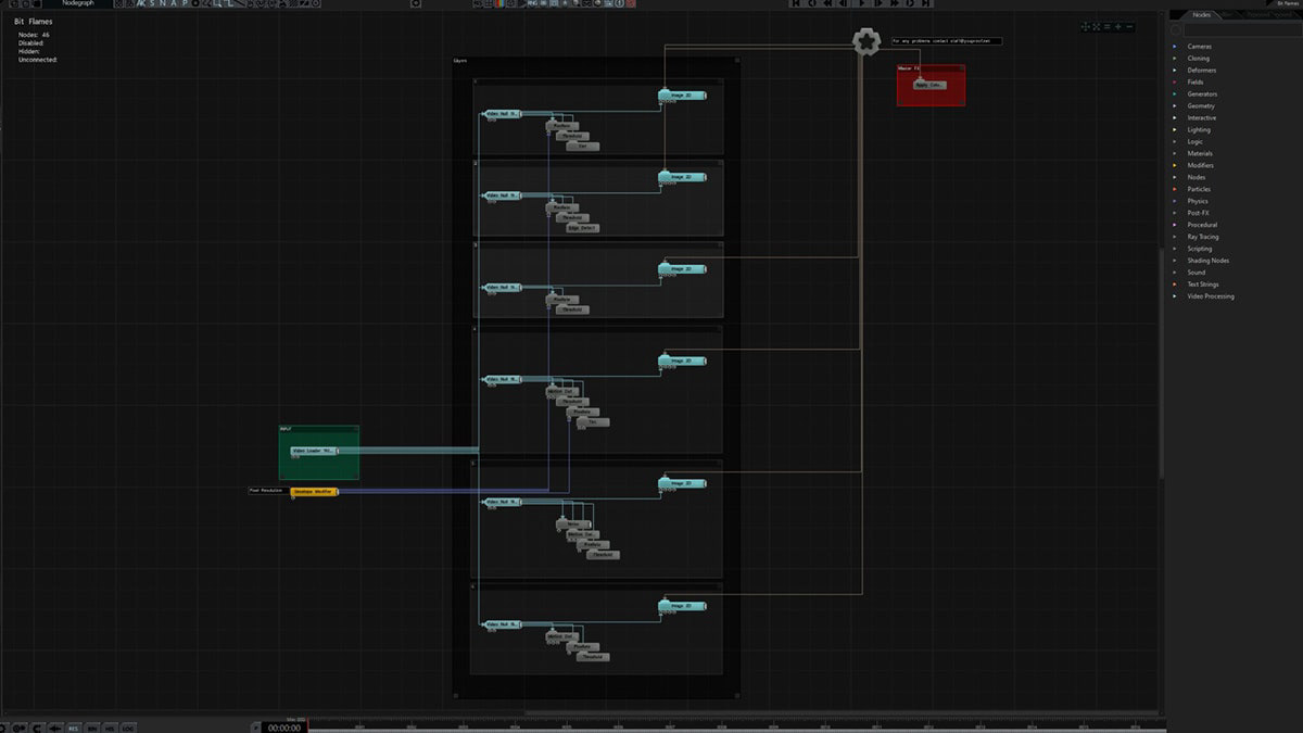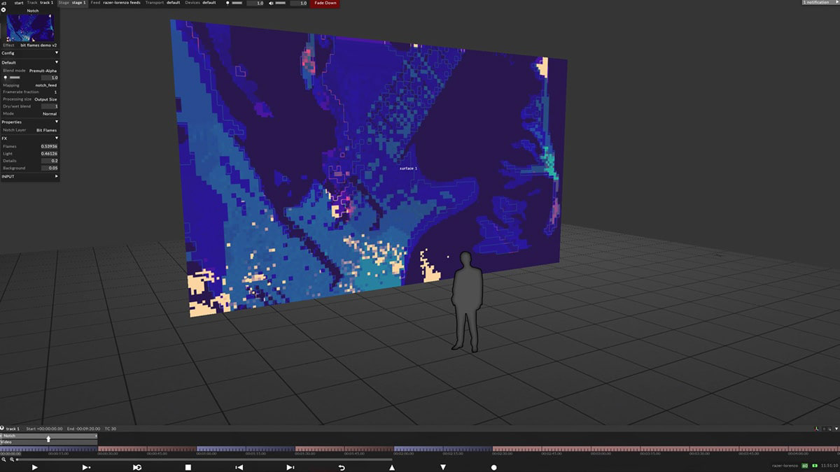 With references to magic, particularly the will-o’-the-wisp of the fantasy world, this IMAG uses a particle system to produce a field that generates the flames, working on the luminance of the video-in. In addition, there are “Glow” and several “Vector Blur” to make everything more liquid and magical.