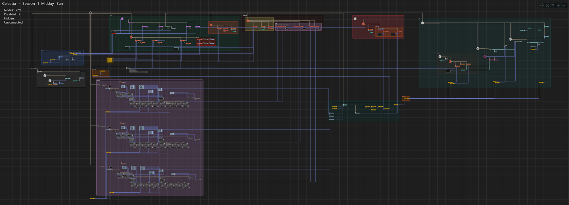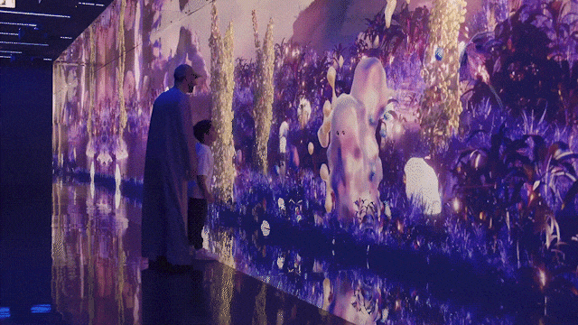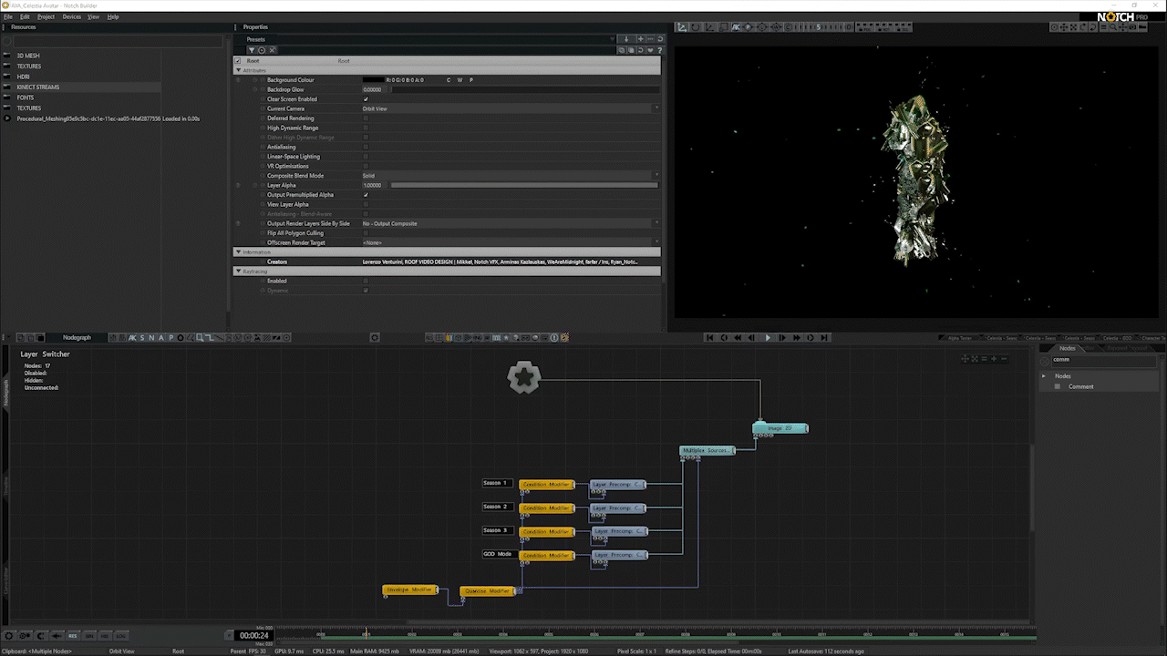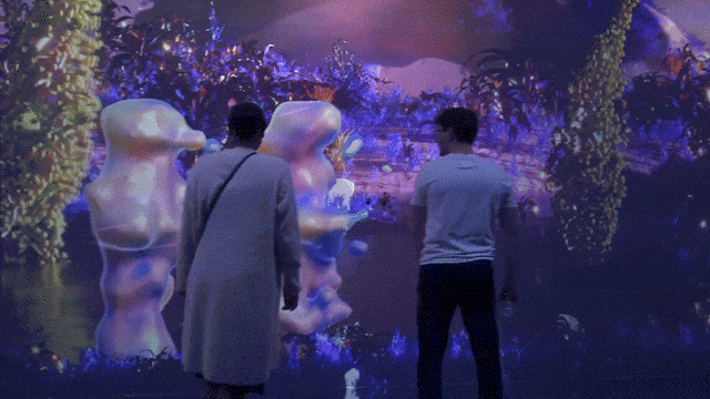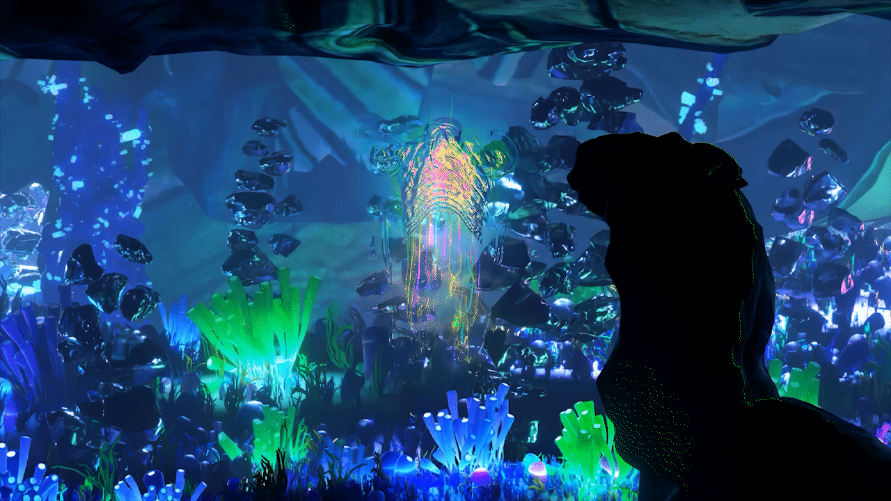 A fantasy and alien world defined the environmental style of Outland, as the public passed by, alien avatars were generated, composed of elements that recalled the elemental background. Different Seasons defined the various moments of the interactive installation, all with a unique style and always different generative characters. The whole thing was composited by a real-time layer generated in Notch and the pre-rendered backgrounds.
