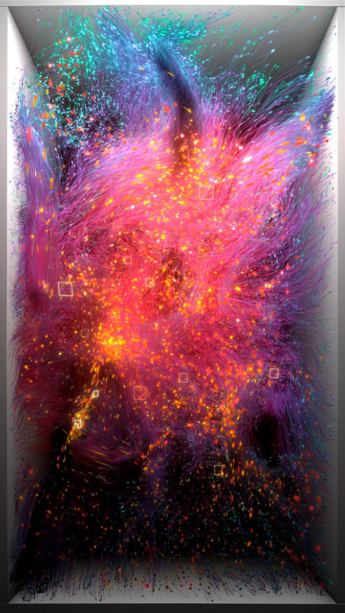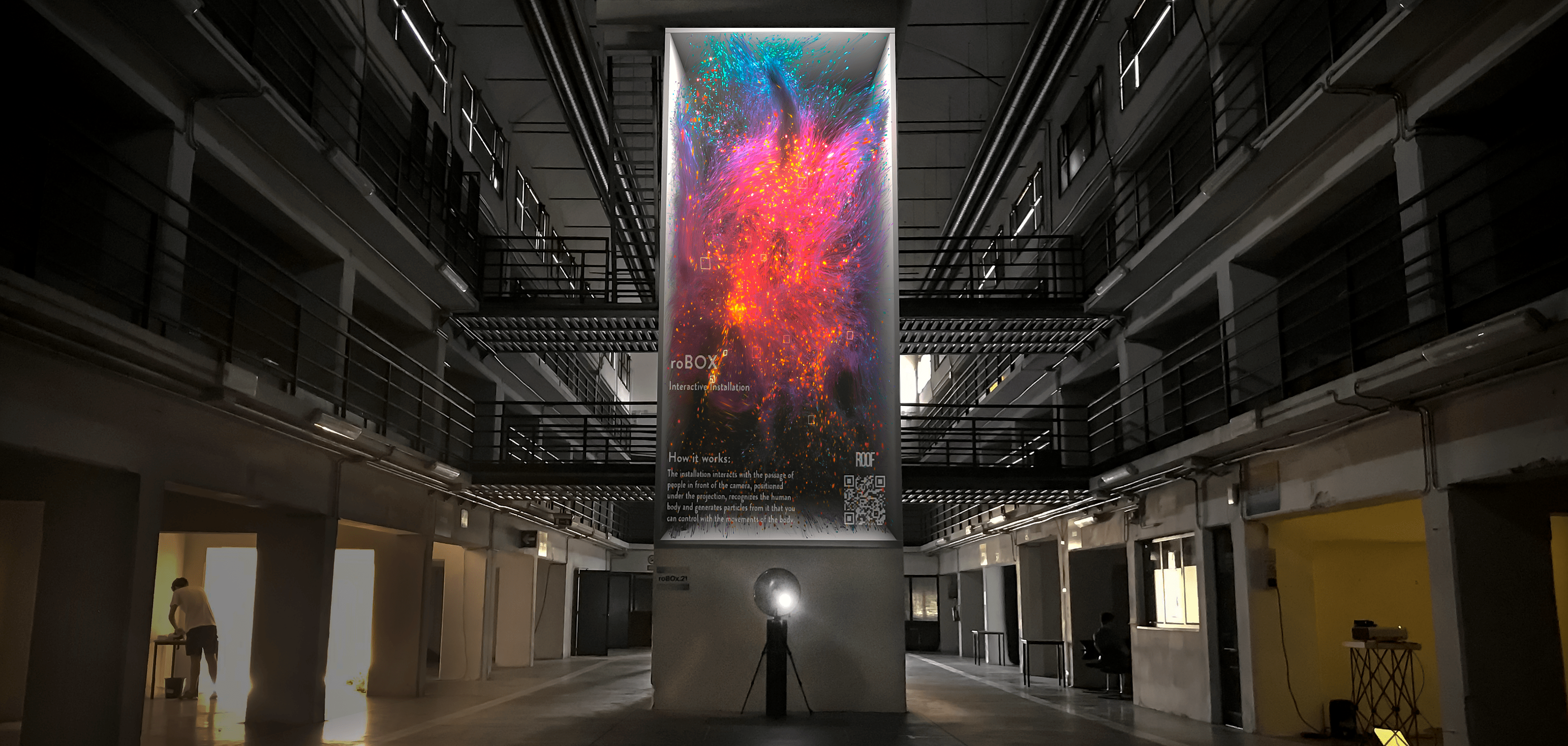 roBOx21 is an interactive installation created by the ROOF videodesign studio, which, with artificial intelligence technology, captures and processes data from a webcam, translating them into colored textures inside an aseptic box. A mapped projection is activated with the human presence, revealing a world of sensations and emotions within what is apparently a white wall. The installation aims to explore the human interior, hidden behind an increasingly pervasive cultural homologation. The inner dimension is not only revealed, but it is also at the same time liberated, "made visible", and enjoyable by ourselves and by those around us. The visitor's physical body will be the actor and turn into a generator of particles and light trails.
