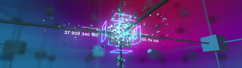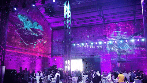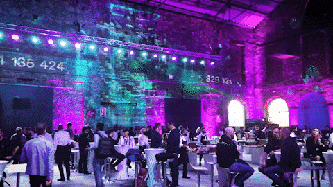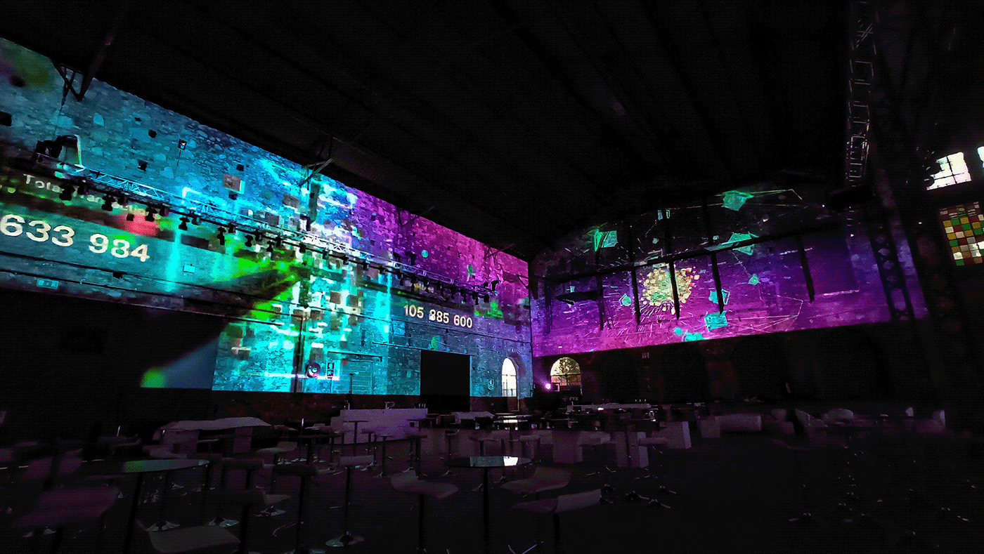 The second projection was on the biggest wall and showed the sloth height and the total transactions. In this case, there wasn't an external script but all worked with two internal .JS, who downloaded data in real-time from solanabeach.io and modified the text strings of the scene.