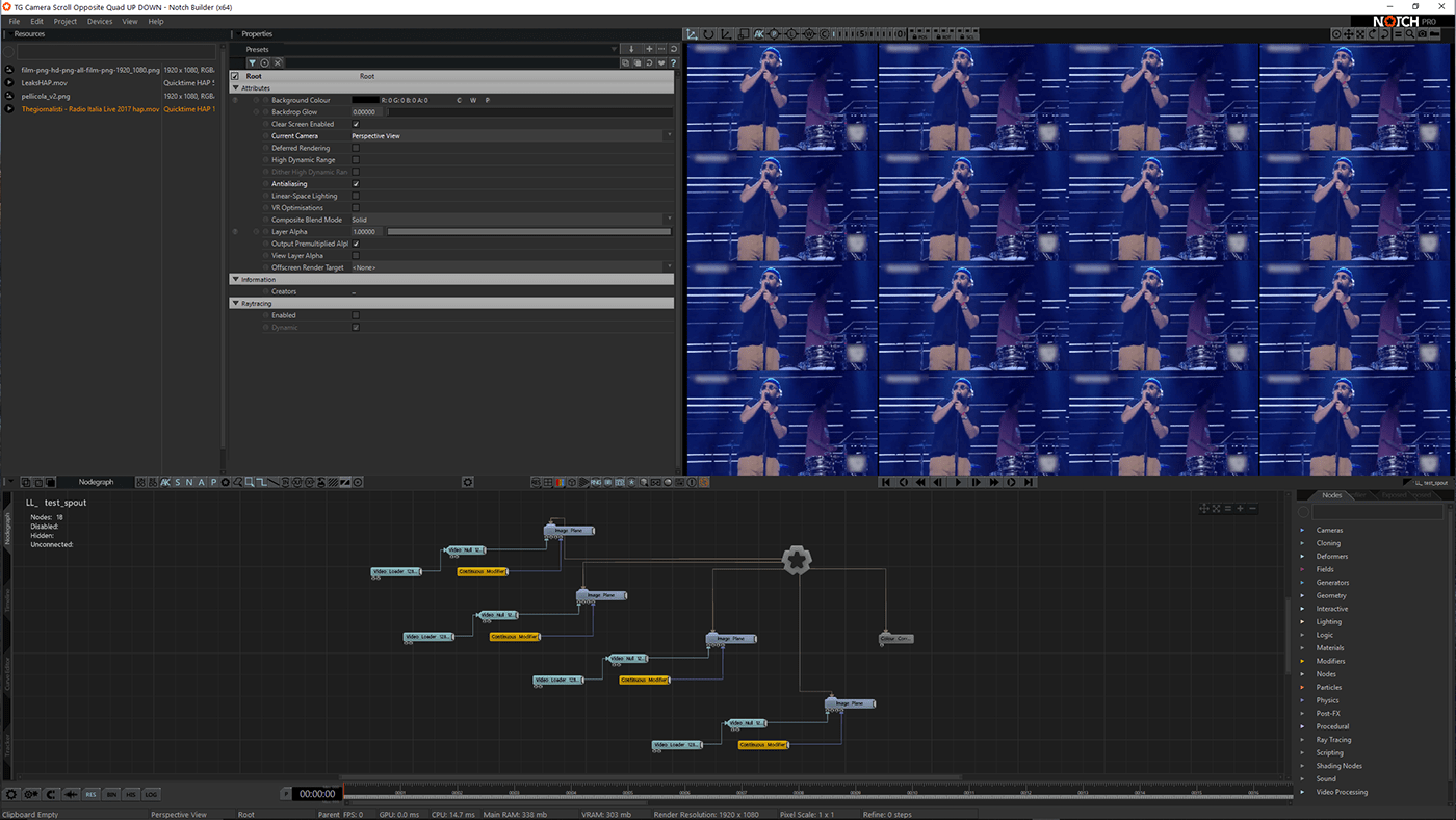 This is the first project I did entirely with Notch, the software I used to design live effects on the camera, used for the last concert by Thegiornalisti at Circo Massimo in Rome, September 2019. I prepare a series of filters the interact with the camera, modifying the video output; so I prepared about ten patches, from the most invasive particles, which were then used during the concert.