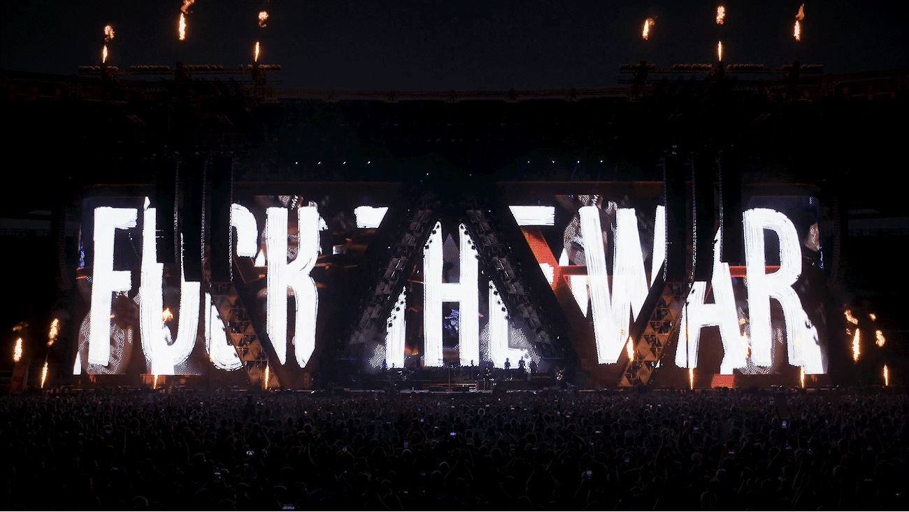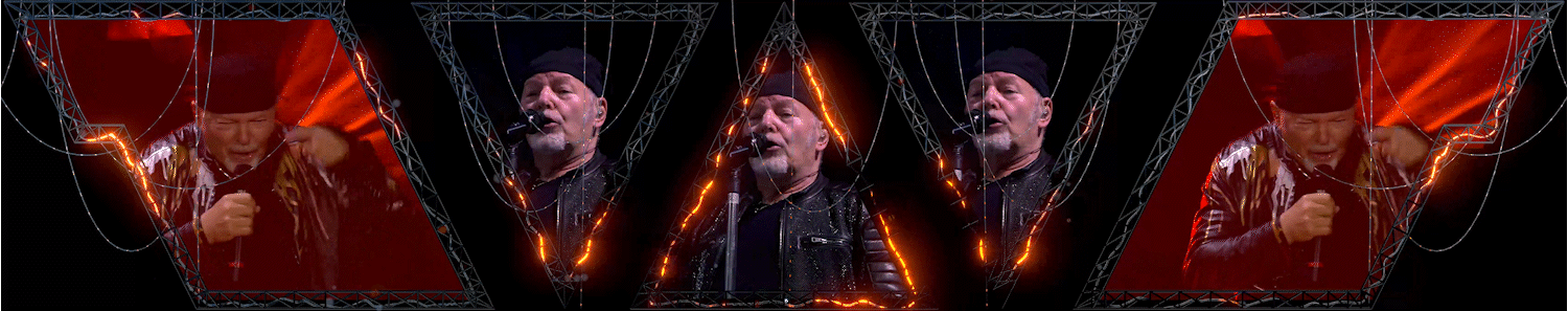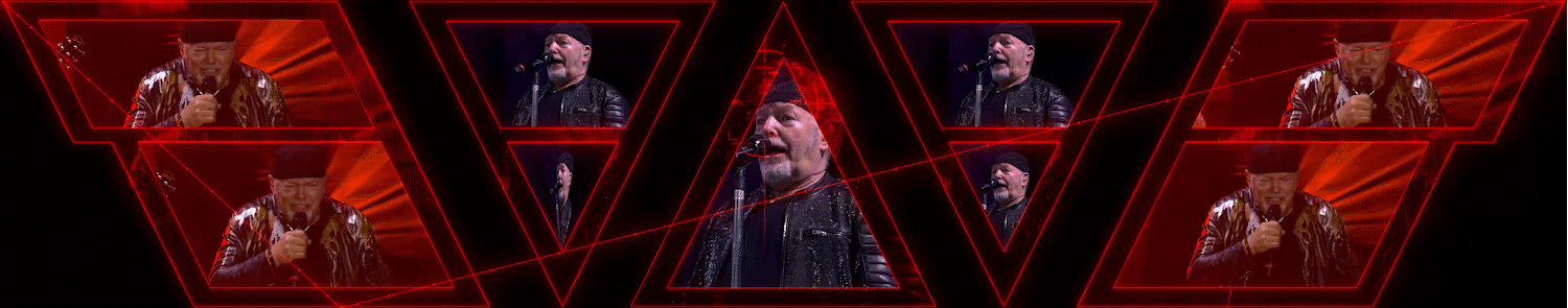 During the song “Siamo qui”, for example, the word “SIAMO” became a dynamic part of the stage: its colors shifted in real time, following the hues captured by the live camera feed—turning green or blue depending on the lighting and Vasco’s movements on stage.