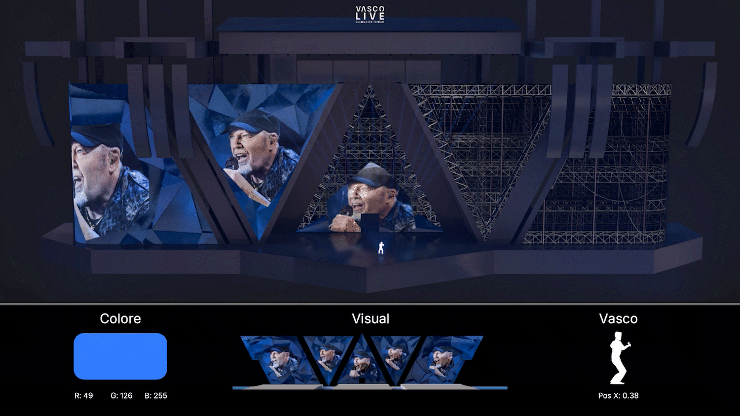 For Vasco Live XXV, we developed an interactive visual system capable of reacting in real time to the live performance on stage.